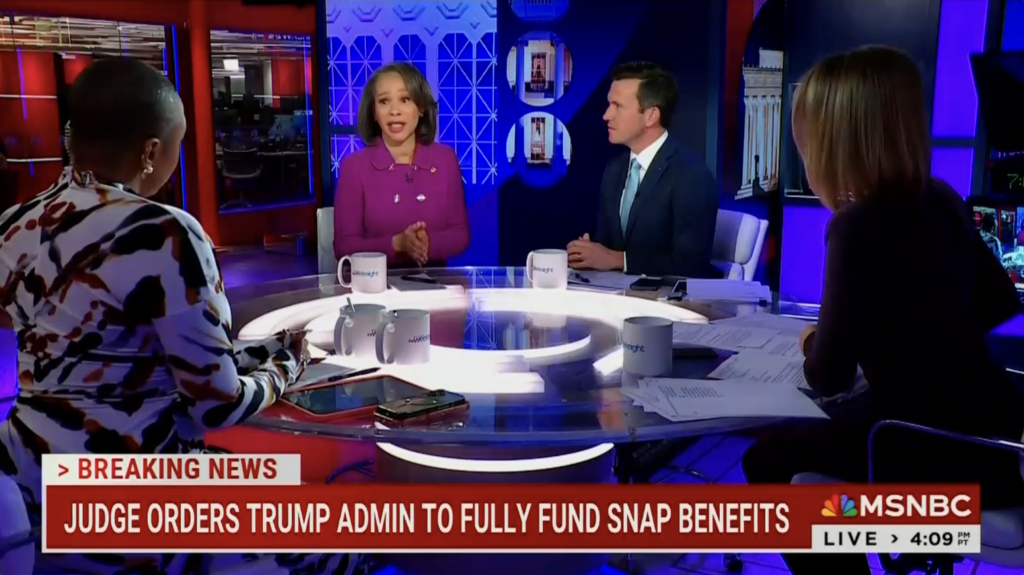 “Let’s take a step back and think about SNAP. The cuts to SNAP started in the ‘big, beautiful bill,’ the [largest] cut in the history of this country… I cannot believe that you would fight the courts to give people access to nutrition and food. It doesn’t make sense. And so, for us, we’re saying again, come to the table, we’re here. We’ve been ready, willing, and able to make sure that we negotiate and open up this government.”