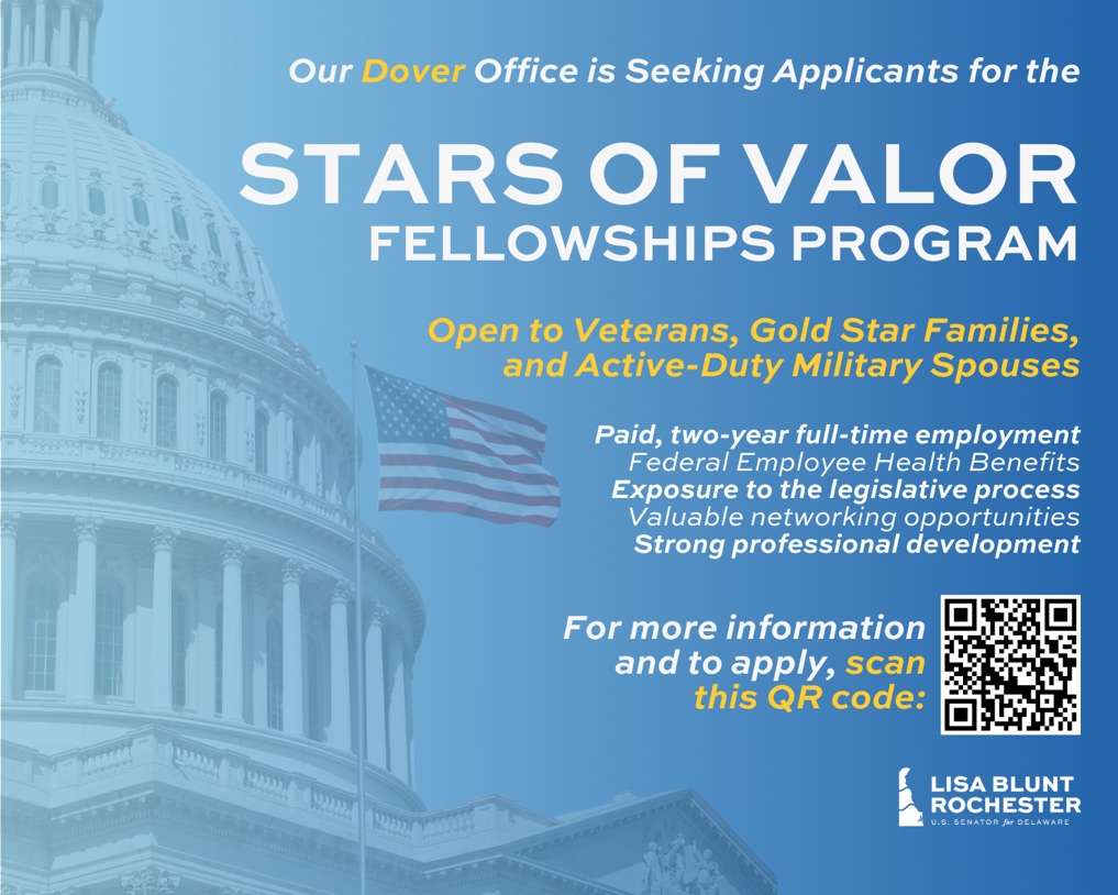 My Dover office is seeking a Stars of Valor Fellow! This is a two-year, paid, full-time opportunity open to veterans, Gold Star families, and Active-Duty military spouses seeking experience working in government. CLICK HERE for more information and to apply by the Saturday, May 9th deadline.